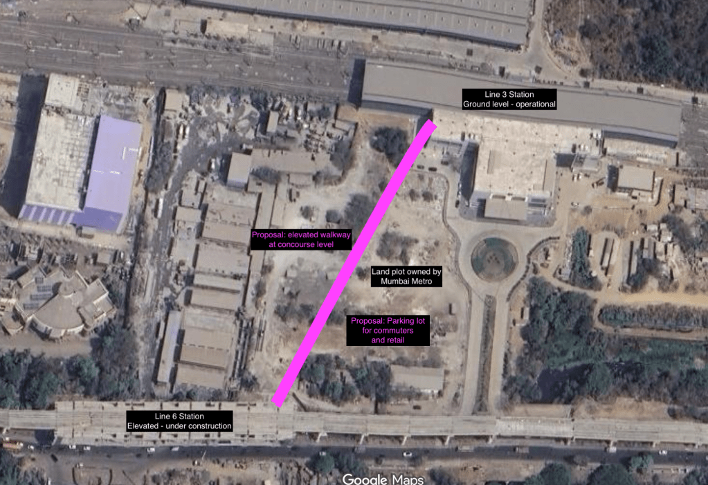 The existing Line 3 station is used by many commuters from Powai who drive their cars to the station and leave them there to head to the city by metro. None of the Mumbai Metro stations have proper car parking facilities due to paucity of land, but this station provides a perfect opportunity to integrate a large car parking facility in the vacant plot of land to encourage more car driving commuters to consider leaving their cars there safely and taking the metro for their daily commute, reducing traffic on already congested roads of Mumbai.