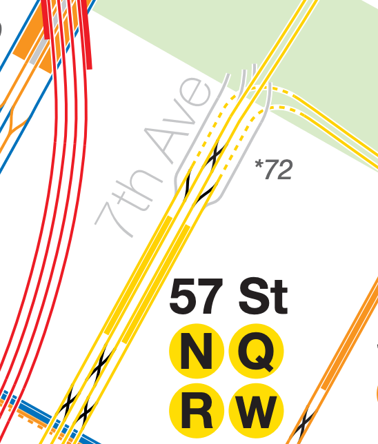 This interchange is a rather unique specimen where the design currently finalized is both more inefficient and more expensive to build than it should ideally have been. Unlike the other interchanges where the two stations are perpendicular to each other, here the two stations for Line 2 (Yellow Line) and Line 7 (Red Line) are parallel to each other and the tracks diverge away after the station. This type of layout is fairly common on the New York Subway and they have adopted the most elegant and simple station design involving two island platforms and four tracks as shown in the diagram below. At the 57 St station seen in it, the two inner tracks serve the Q line which goes straight while the two outer tracks serve the NRW lines which diverge to the right. Passengers wanting to transfer between the Q and NRW or vice versa have to just get off and walk over to the other side of the same platform to change trains in both directions. This is the most efficient transfer design possible between different metro lines.